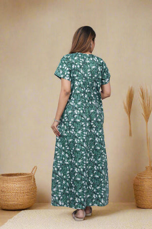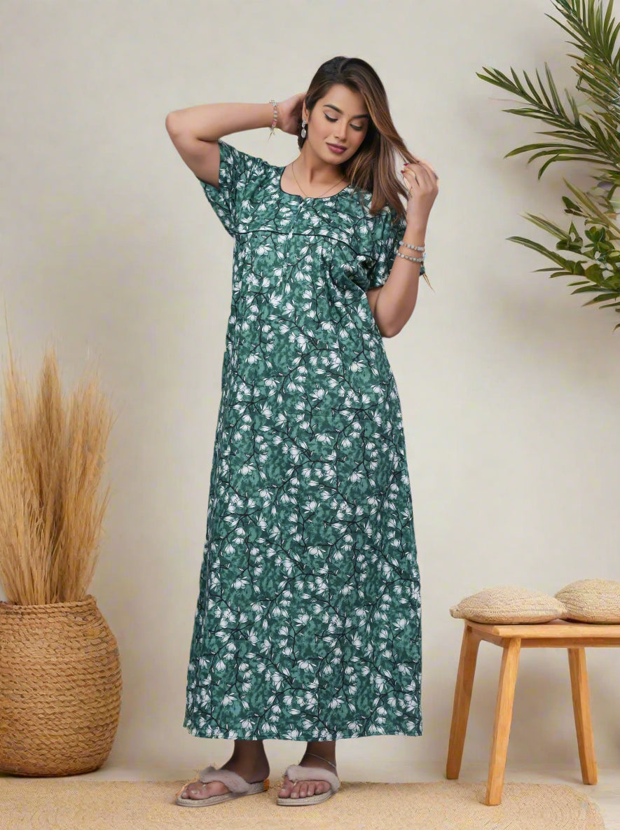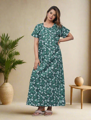 Experience comfort and style with this Cotton Printed Night Gown for Women. Crafted from breathable cotton fabric, it ensures a soft touch against the skin and promotes restful sleep. The elegant printed design adds a subtle charm, making it ideal for nighttime wear or relaxing at home. Its lightweight construction supports all-night comfort while maintaining durability for everyday use. Perfect for women seeking a blend of practicality and aesthetic appeal in their nightwear.
