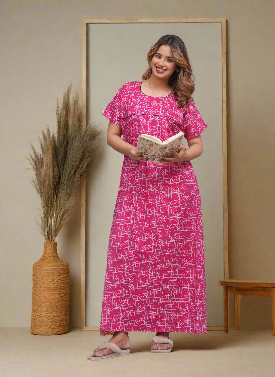 Experience comfort and style with this Cotton Printed Night Gown for Women. Crafted from breathable cotton fabric, it ensures a soft touch against the skin and promotes restful sleep. The elegant printed design adds a subtle charm, making it ideal for nighttime wear or relaxing at home. Its lightweight construction supports all-night comfort while maintaining durability for everyday use. Perfect for women seeking a blend of practicality and aesthetic appeal in their nightwear.