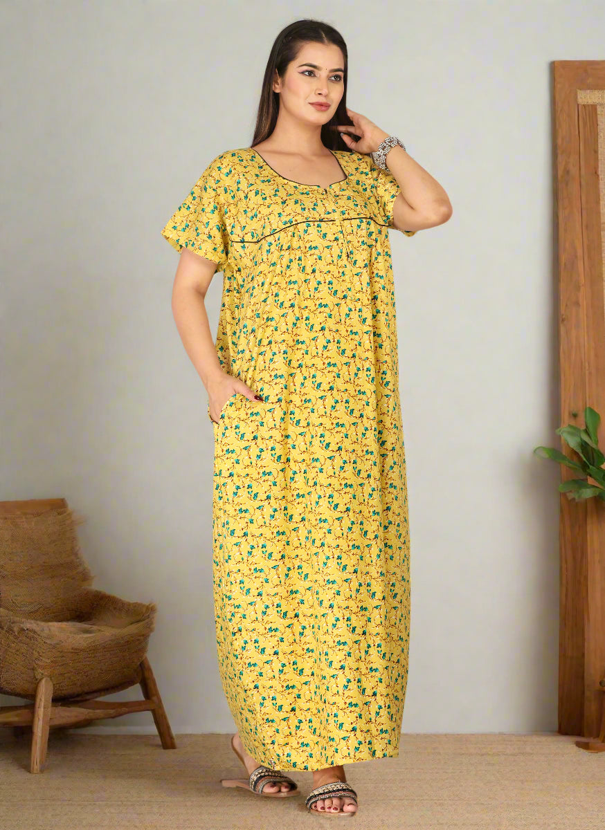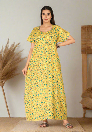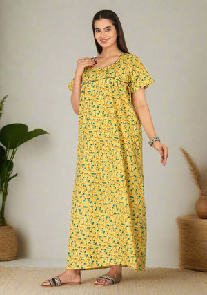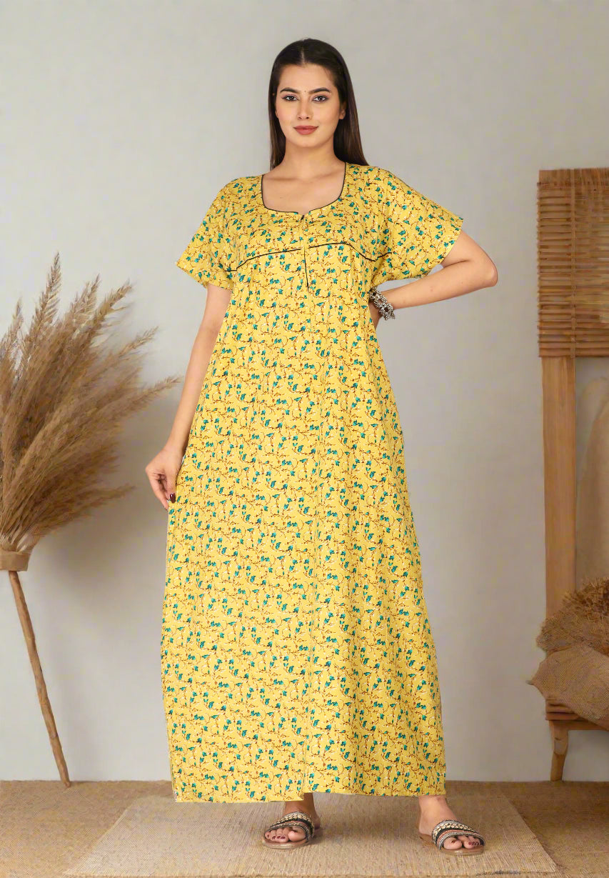 Experience comfort and style with this Cotton Printed Night Gown for Women. Crafted from breathable cotton fabric, it ensures a soft touch against the skin and promotes restful sleep. The elegant printed design adds a subtle charm, making it ideal for nighttime wear or relaxing at home. Its lightweight construction supports all-night comfort while maintaining durability for everyday use. Perfect for women seeking a blend of practicality and aesthetic appeal in their nightwear.