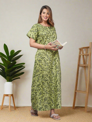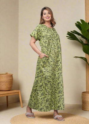 Experience comfort and style with this Cotton Printed Night Gown for Women. Crafted from breathable cotton fabric, it ensures a soft touch against the skin and promotes restful sleep. The elegant printed design adds a subtle charm, making it ideal for nighttime wear or relaxing at home. Its lightweight construction supports all-night comfort while maintaining durability for everyday use. Perfect for women seeking a blend of practicality and aesthetic appeal in their nightwear.