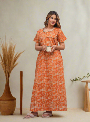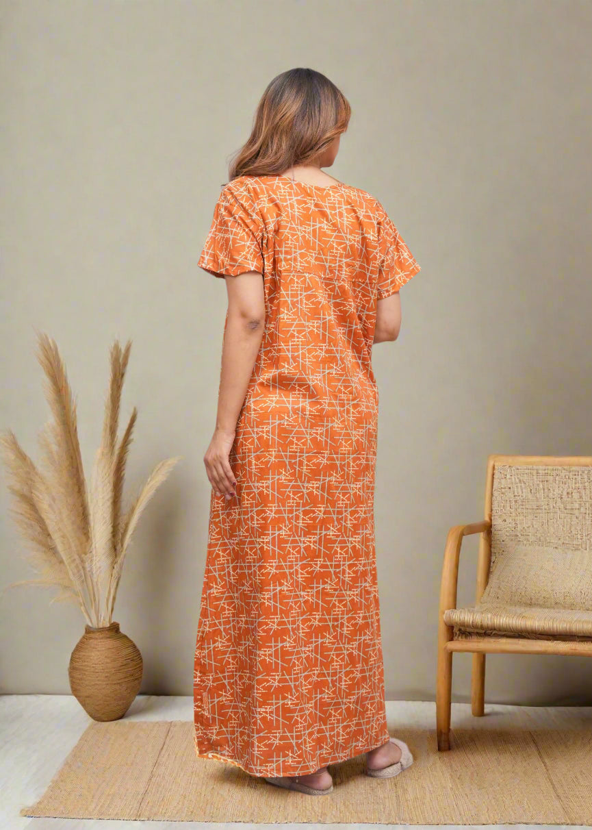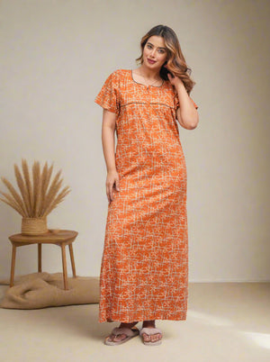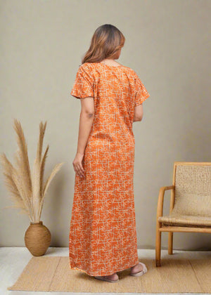 Experience comfort and style with this Cotton Printed Night Gown for Women. Crafted from breathable cotton fabric, it ensures a soft touch against the skin and promotes restful sleep. The elegant printed design adds a subtle charm, making it ideal for nighttime wear or relaxing at home. Its lightweight construction supports all-night comfort while maintaining durability for everyday use. Perfect for women seeking a blend of practicality and aesthetic appeal in their nightwear.