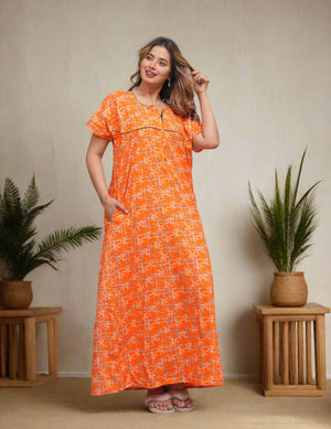 Experience comfort and style with this Cotton Printed Night Gown for Women. Crafted from breathable cotton fabric, it ensures a soft touch against the skin and promotes restful sleep. The elegant printed design adds a subtle charm, making it ideal for nighttime wear or relaxing at home. Its lightweight construction supports all-night comfort while maintaining durability for everyday use. Perfect for women seeking a blend of practicality and aesthetic appeal in their nightwear.
