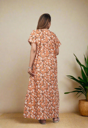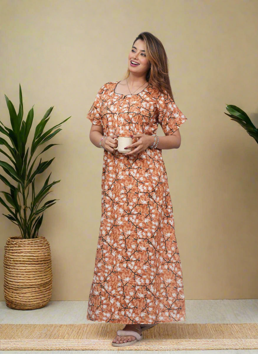 Experience comfort and style with this Cotton Printed Night Gown for Women. Crafted from breathable cotton fabric, it ensures a soft touch against the skin and promotes restful sleep. The elegant printed design adds a subtle charm, making it ideal for nighttime wear or relaxing at home. Its lightweight construction supports all-night comfort while maintaining durability for everyday use. Perfect for women seeking a blend of practicality and aesthetic appeal in their nightwear.