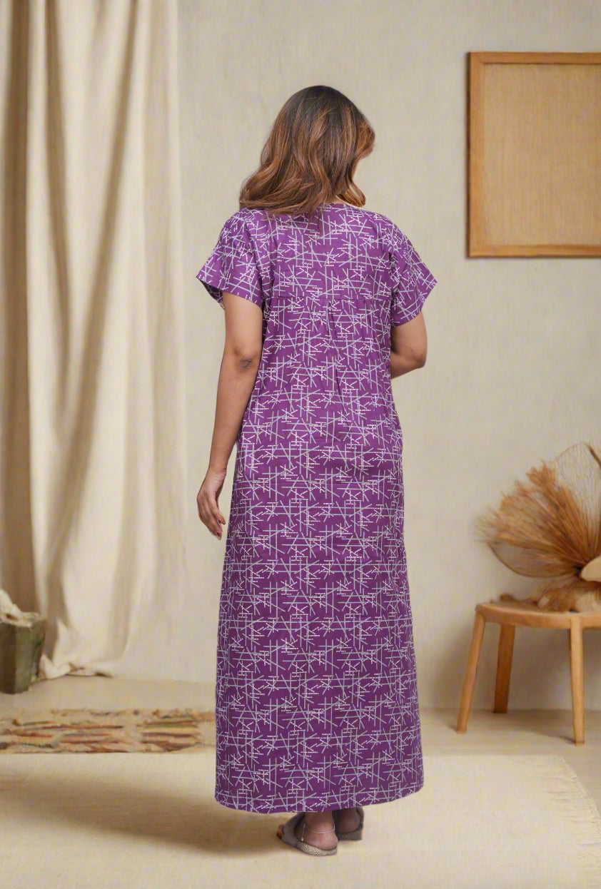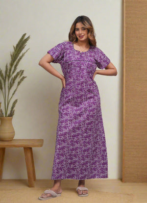 Experience comfort and style with this Cotton Printed Night Gown for Women. Crafted from breathable cotton fabric, it ensures a soft touch against the skin and promotes restful sleep. The elegant printed design adds a subtle charm, making it ideal for nighttime wear or relaxing at home. Its lightweight construction supports all-night comfort while maintaining durability for everyday use. Perfect for women seeking a blend of practicality and aesthetic appeal in their nightwear.
