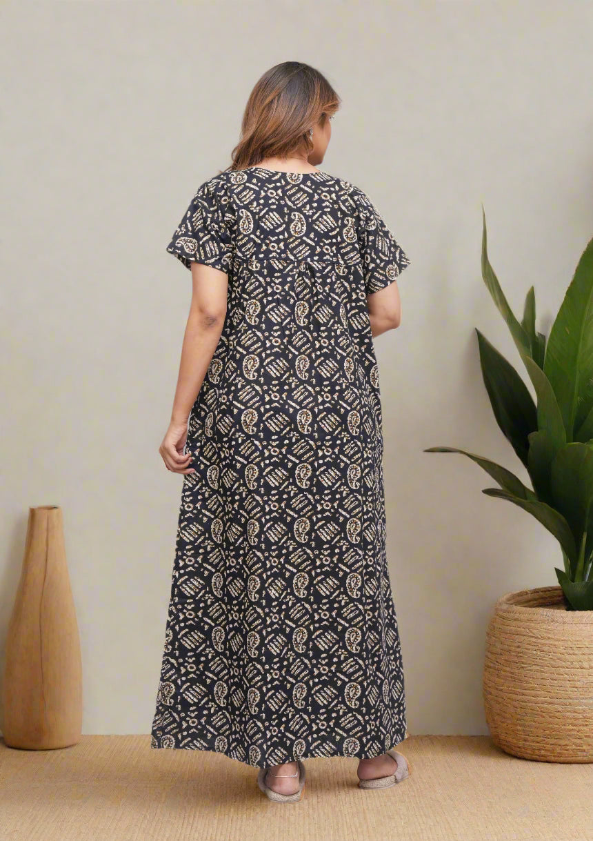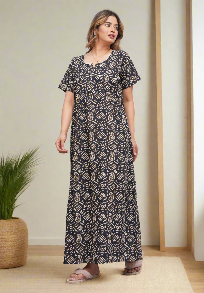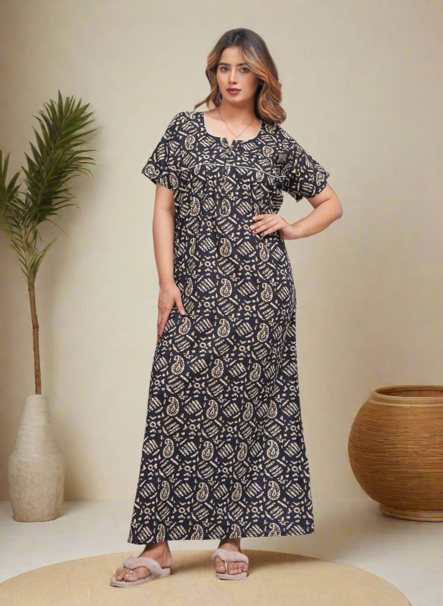 Experience comfort and style with this Cotton Printed Night Gown for Women. Crafted from breathable cotton fabric, it ensures a soft touch against the skin and promotes restful sleep. The elegant printed design adds a subtle charm, making it ideal for nighttime wear or relaxing at home. Its lightweight construction supports all-night comfort while maintaining durability for everyday use. Perfect for women seeking a blend of practicality and aesthetic appeal in their nightwear.