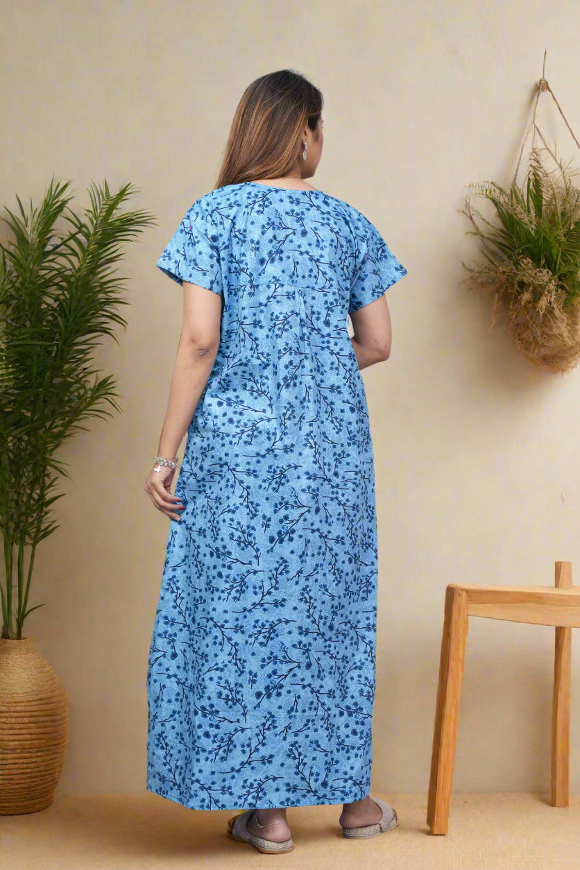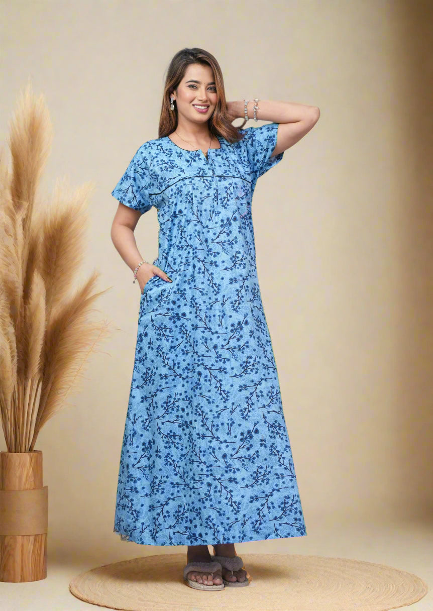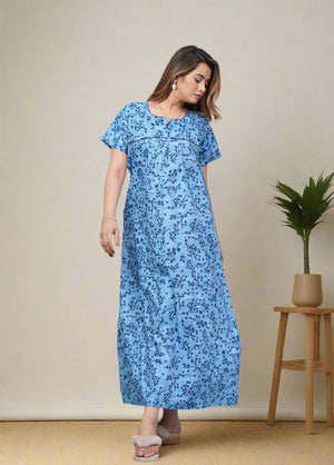 Experience comfort and style with this Cotton Printed Night Gown for Women. Crafted from breathable cotton fabric, it ensures a soft touch against the skin and promotes restful sleep. The elegant printed design adds a subtle charm, making it ideal for nighttime wear or relaxing at home. Its lightweight construction supports all-night comfort while maintaining durability for everyday use. Perfect for women seeking a blend of practicality and aesthetic appeal in their nightwear.