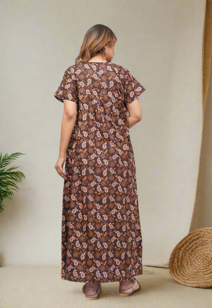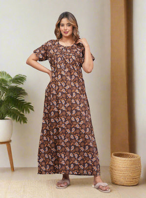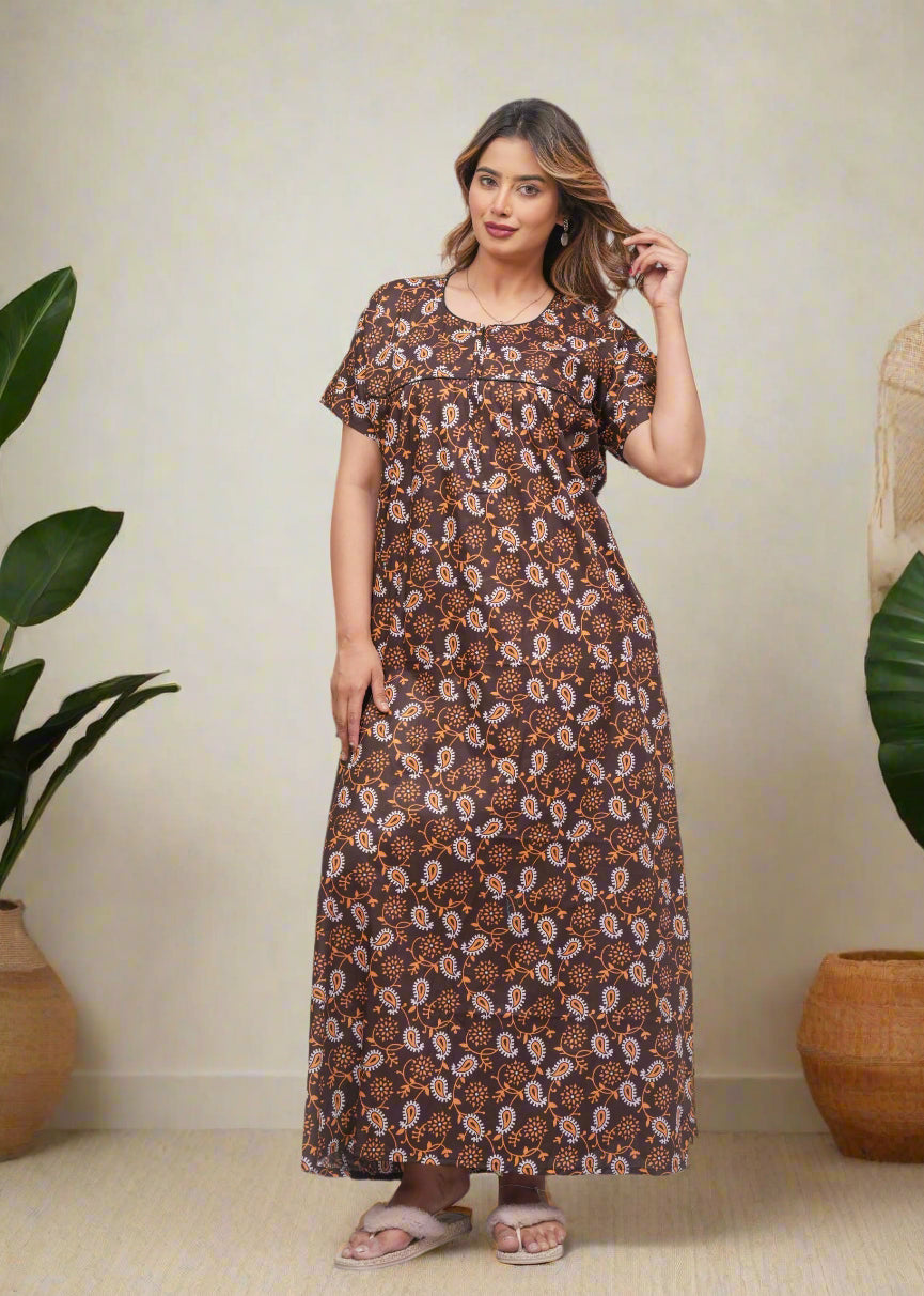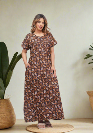 Experience comfort and style with this Cotton Printed Night Gown for Women. Crafted from breathable cotton fabric, it ensures a soft touch against the skin and promotes restful sleep. The elegant printed design adds a subtle charm, making it ideal for nighttime wear or relaxing at home. Its lightweight construction supports all-night comfort while maintaining durability for everyday use. Perfect for women seeking a blend of practicality and aesthetic appeal in their nightwear.