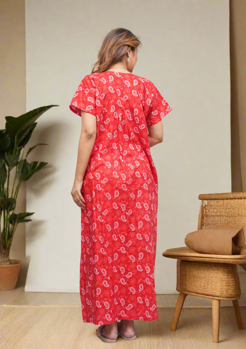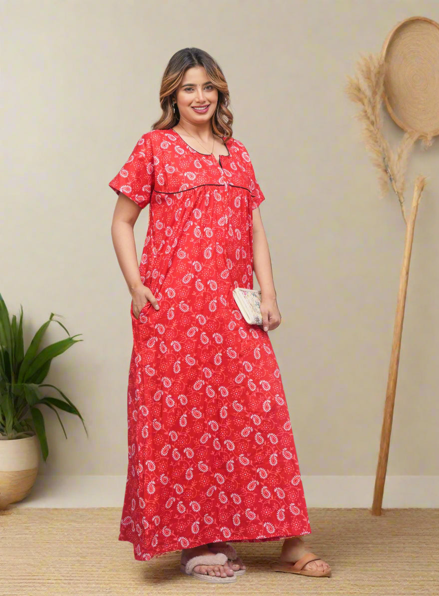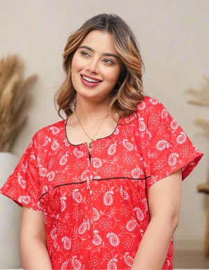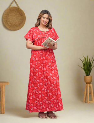 Experience comfort and style with this Cotton Printed Night Gown for Women. Crafted from breathable cotton fabric, it ensures a soft touch against the skin and promotes restful sleep. The elegant printed design adds a subtle charm, making it ideal for nighttime wear or relaxing at home. Its lightweight construction supports all-night comfort while maintaining durability for everyday use. Perfect for women seeking a blend of practicality and aesthetic appeal in their nightwear.