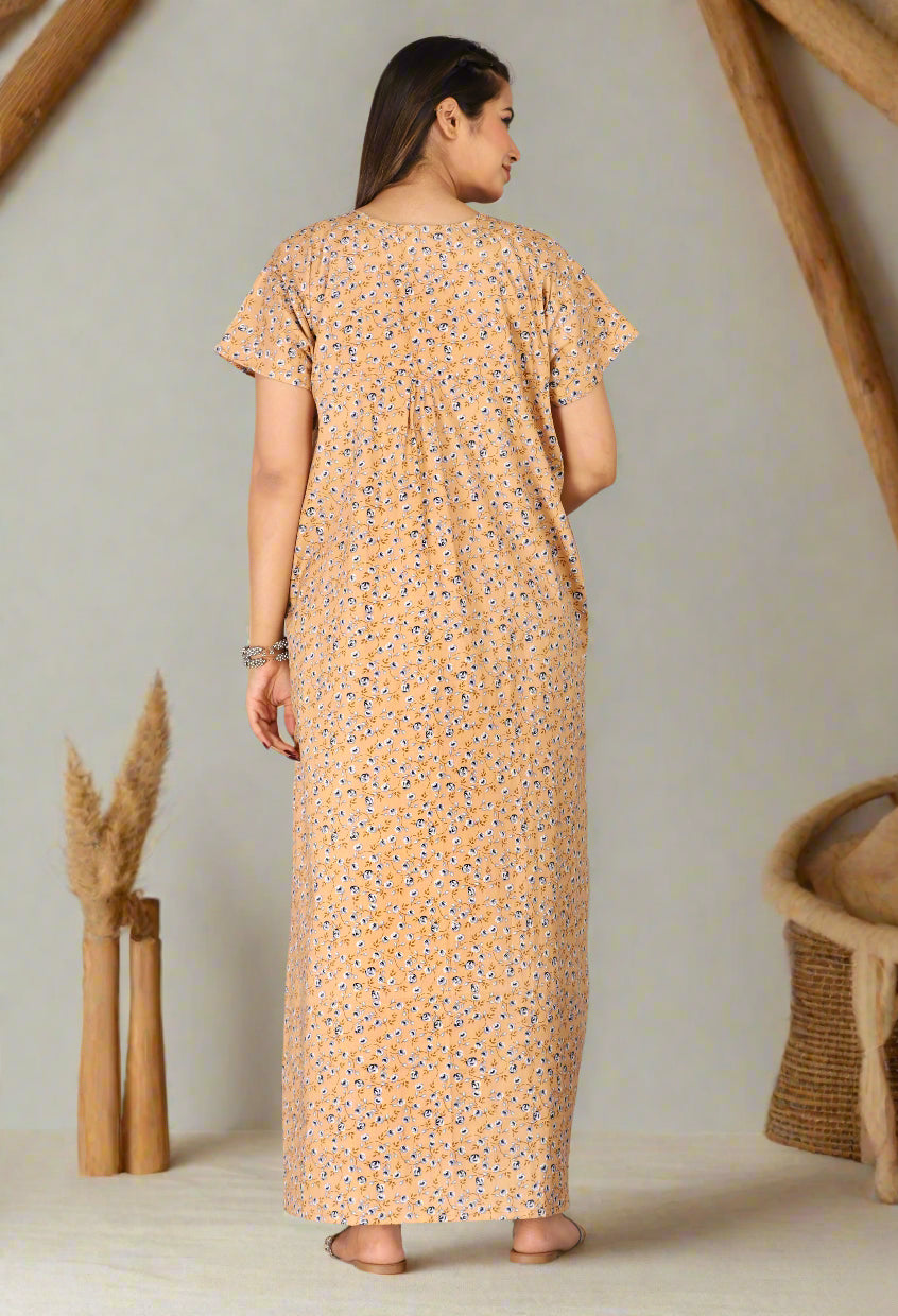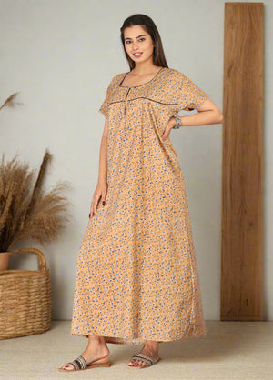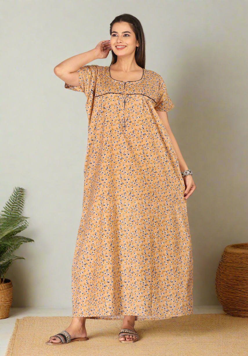 Experience comfort and style with this Cotton Printed Night Gown for Women. Crafted from breathable cotton fabric, it ensures a soft touch against the skin and promotes restful sleep. The elegant printed design adds a subtle charm, making it ideal for nighttime wear or relaxing at home. Its lightweight construction supports all-night comfort while maintaining durability for everyday use. Perfect for women seeking a blend of practicality and aesthetic appeal in their nightwear.