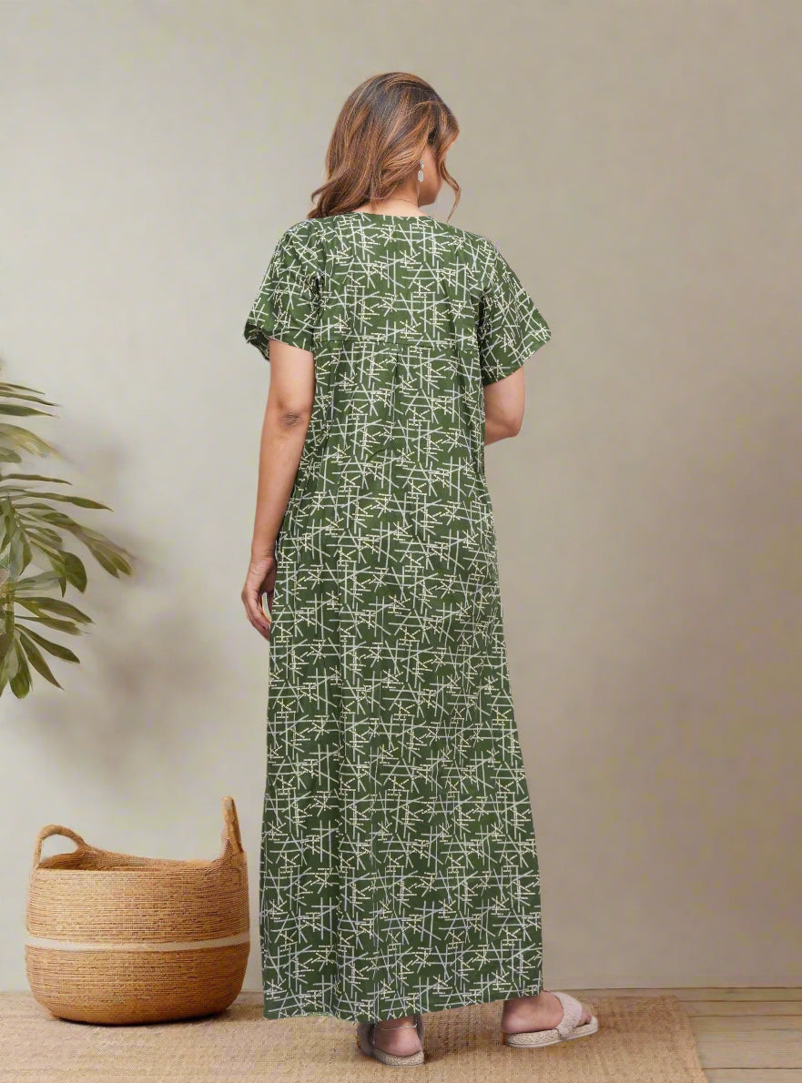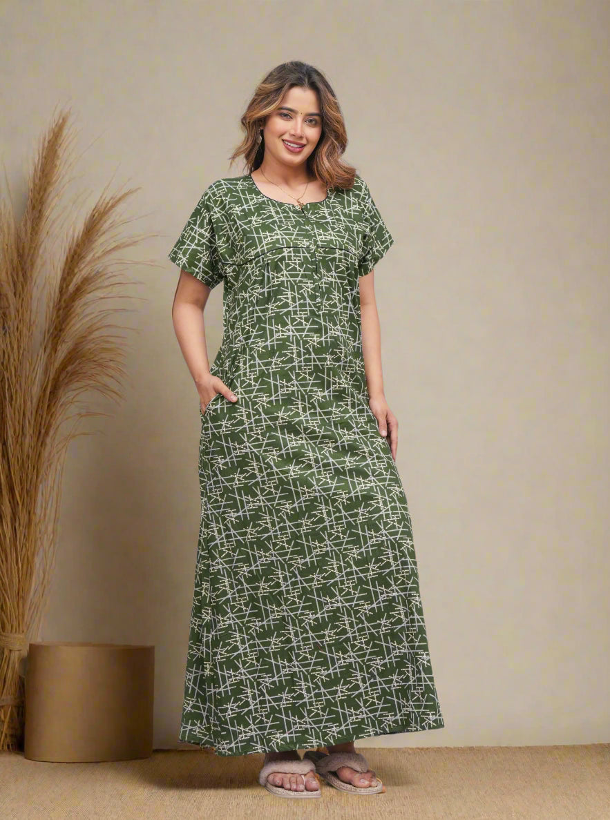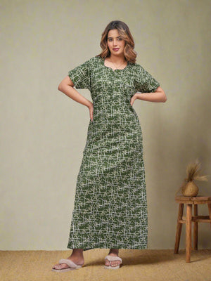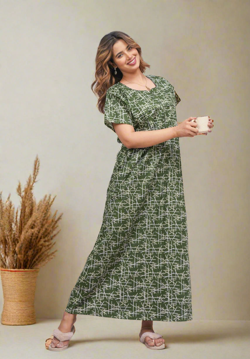 Experience comfort and style with this Cotton Printed Night Gown for Women. Crafted from breathable cotton fabric, it ensures a soft touch against the skin and promotes restful sleep. The elegant printed design adds a subtle charm, making it ideal for nighttime wear or relaxing at home. Its lightweight construction supports all-night comfort while maintaining durability for everyday use. Perfect for women seeking a blend of practicality and aesthetic appeal in their nightwear.